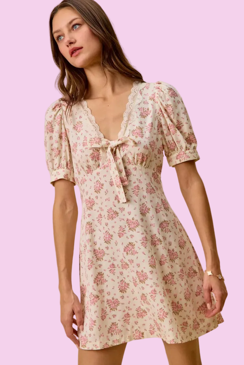 SO ME - Floral Lace Trimmed Short Sleeves Mini Dress - Size: S-XL