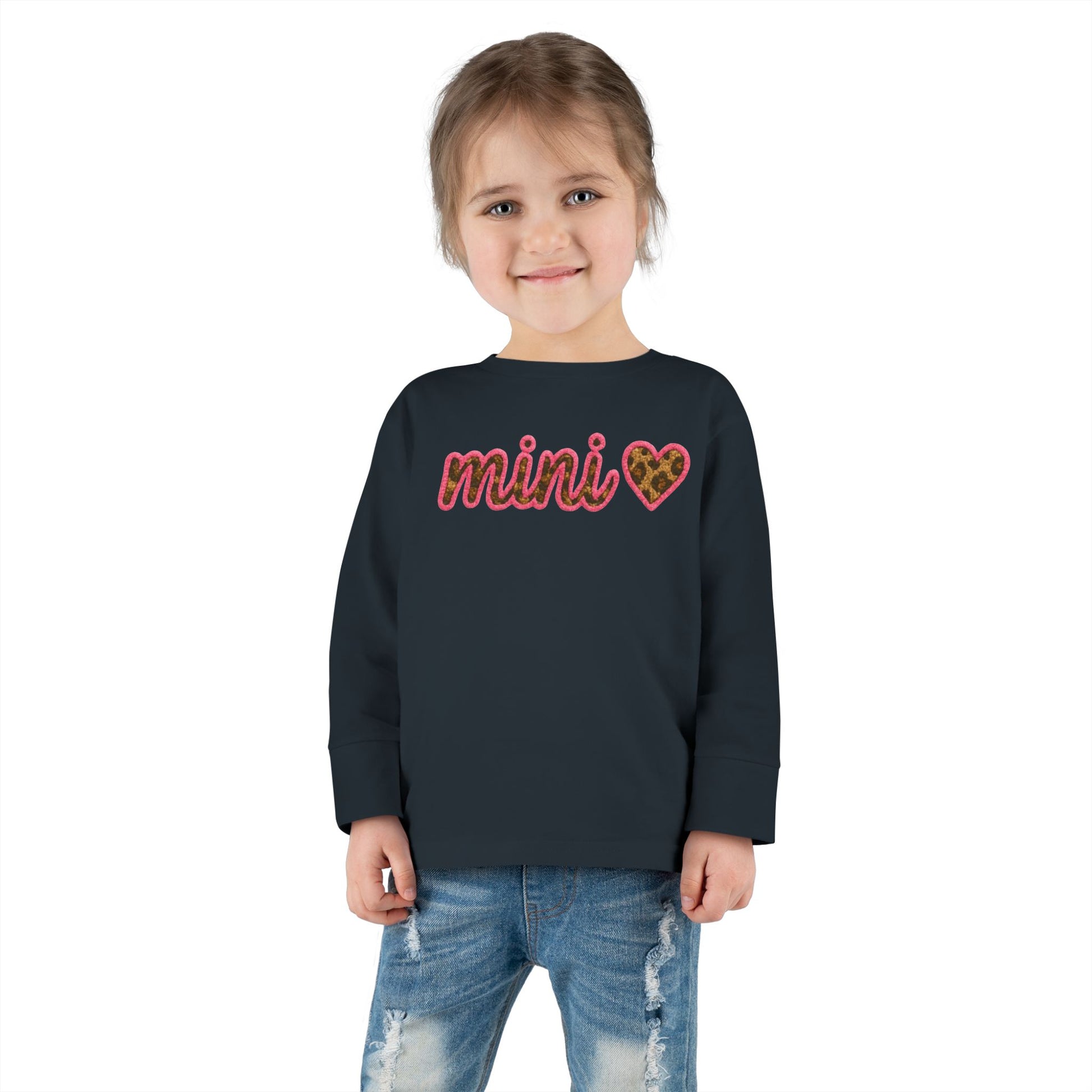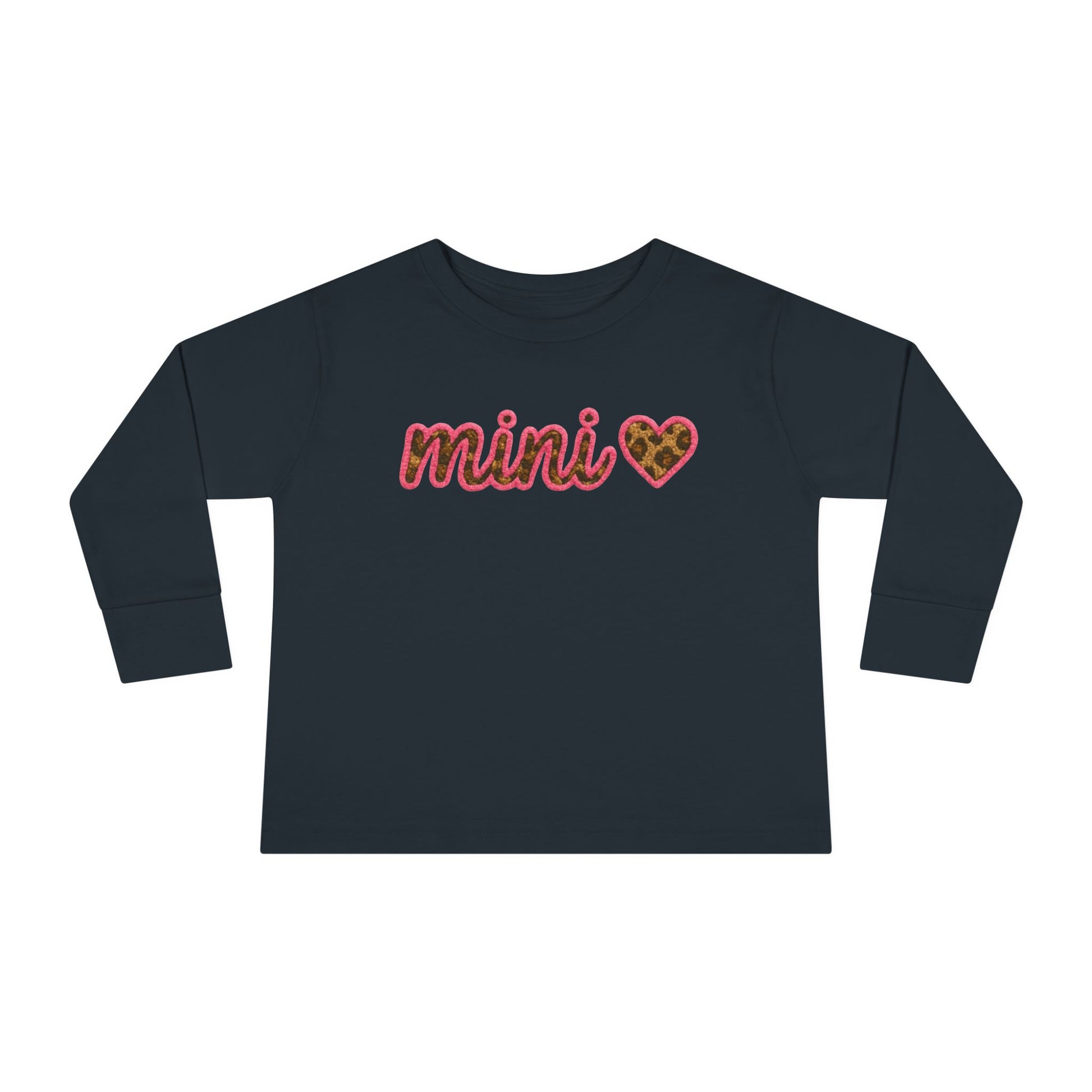 Mama & Mini "Mini" Faux Embroidery Pink Leopard Print Heart DTG Toddler Long Sleeve Tee - Size: 2T-6T